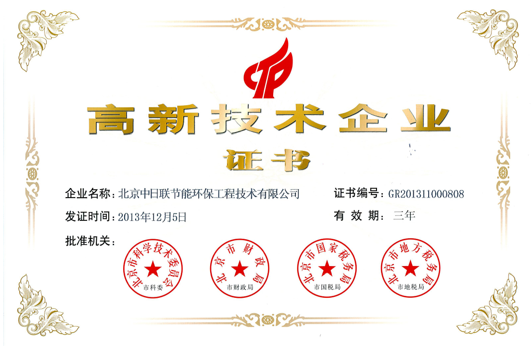 年3月,北京中日联节能环保工程技术公司正式取得了由国家科技部认定的高新技术企业证书,这对于中日联公司继续以优质环保技术开发市场,实现健康发展将起到良好的推动作用。